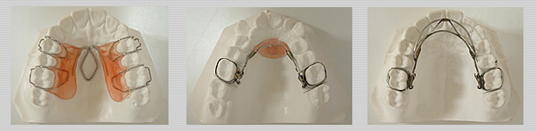 症例によって様々ですが、基本的に歯の裏側につける目立たないもの、または取り外しのできるもの(可撤式)が多いです。